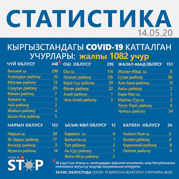 Бишкек, 14.05.20. /Кабар/. Кыргызстанда 14-май саат 10:00гө карата коронавирус жуктурган дагы 38 жаңы учур катталды. Жалпы ооругандардын саны 1082 кишиге жетти.