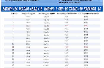 15-майда күндүз Ош облусунун көпчүлүк аймактарында, Жалал-Абад, Баткен облустарынын кээ бир райондорунда жаан жаап, күн күркүрөшү, бийик тоолуу райондордо кар жаашы күтүлөт.