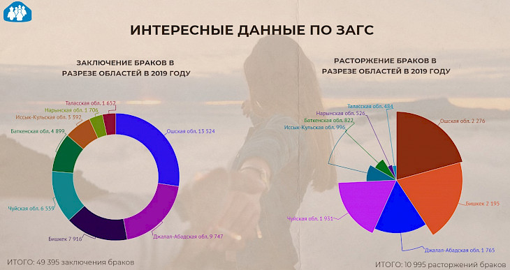Ош шаарында, Нарын Талас облустарында ажырашууга арыз берген жуптардын саны 500дөн ашкан эмес. Ысык-Көл жана Баткен облусунда 900 жуп ажырашууну чечкен.