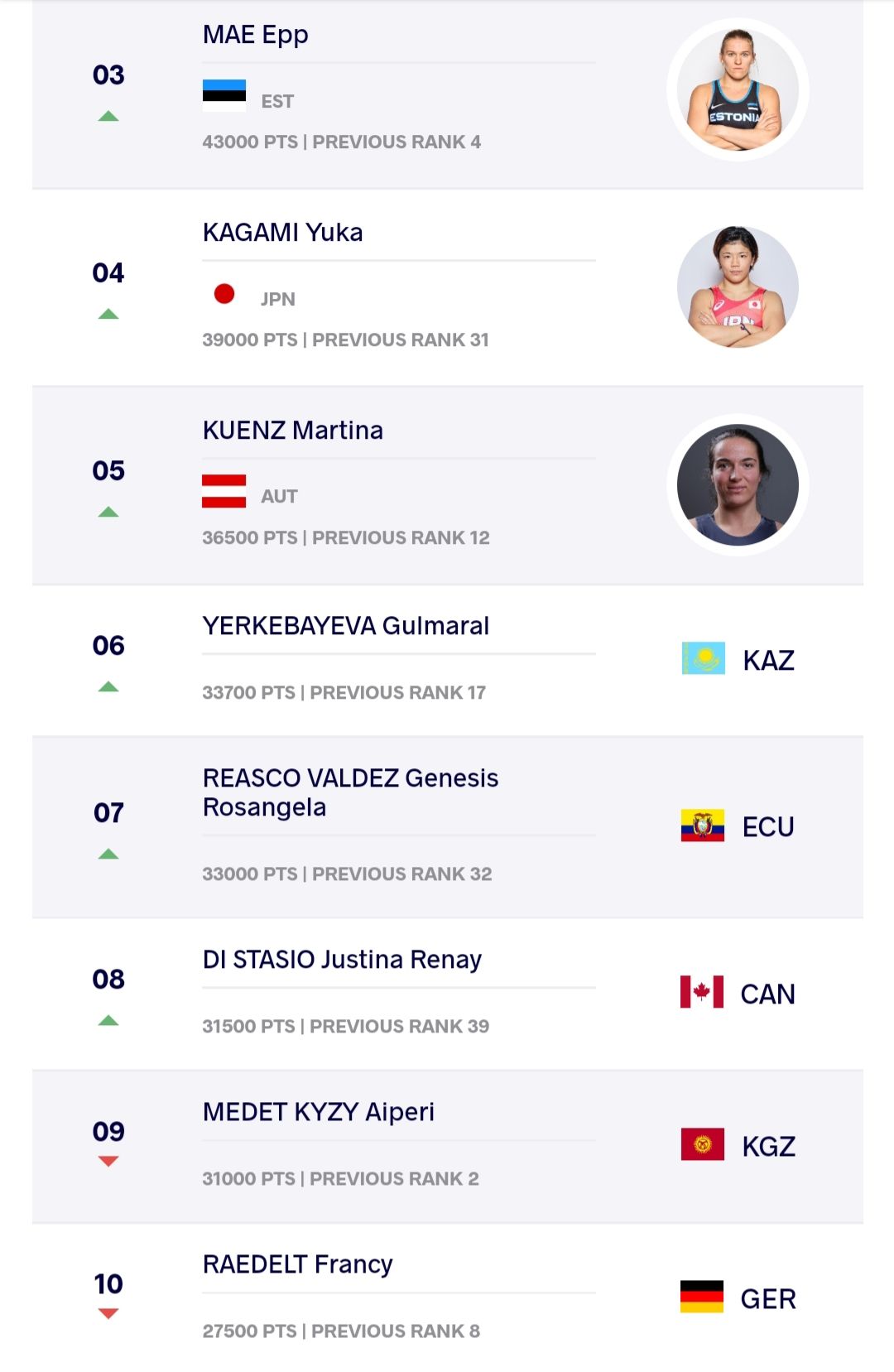 Бишкек, 03.10.22. /Адил Төлөгөнов - Кабар/. Кыргызстандык спортчу Айсулуу Тыныбекова Бириккен күрөш дүйнөсүнүн (UWW) рейтингинде 6-орунга түшүп калды.
