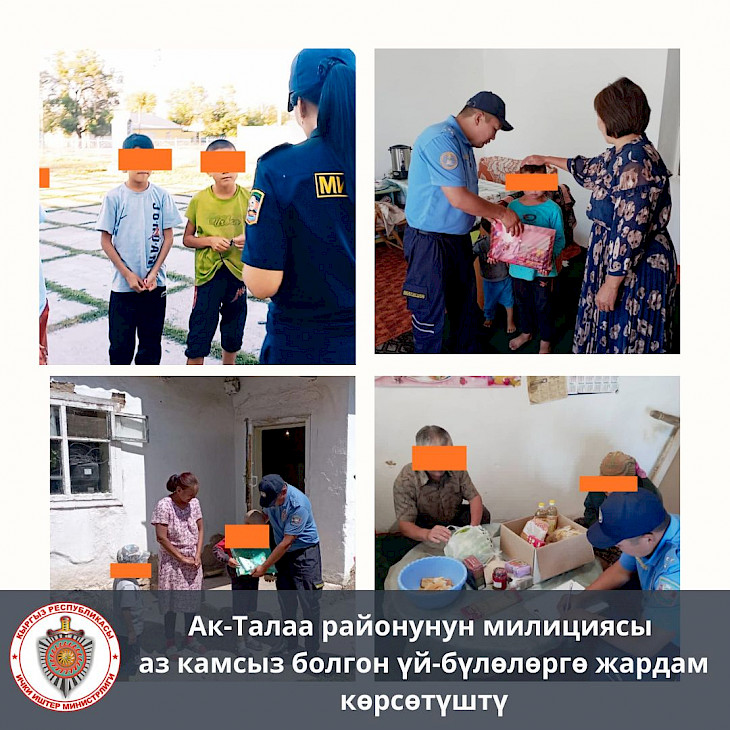 Бишкек, 30.08.22. /Кабар/. Ак-Талаа райондук ички иштер бөлүмүнүн коомдук коопсуздук кызматынын кызматкерлери 2022-2023-окуу жылынын башталышына карата аз камсыз болгон үй-бүлөлөргө азык-түлүк, ал эми балдарына окуу куралдарын алып беришип, жардам көрсөтүштү.