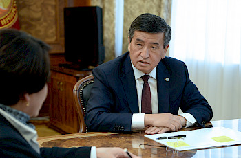 “Акорда” президенттик сарайында Кыргызстан менен Казакстандын мамлекеттик желектери илинген, Ардак кароол тизилип, килем төшөлгөн.