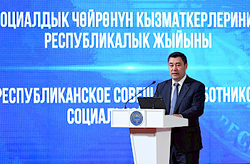 “Акорда” президенттик сарайында Кыргызстан менен Казакстандын мамлекеттик желектери илинген, Ардак кароол тизилип, килем төшөлгөн.