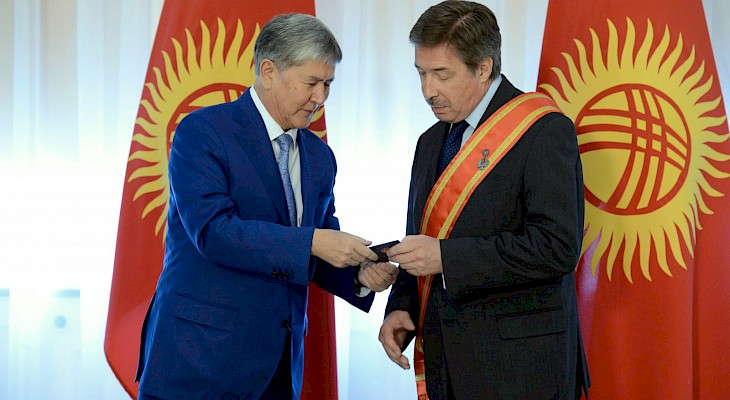 Бишкек, 15-июнь /Кабар/. Кыргыз Республикасынын Президенти Алмазбек Атамбаев бүгүн, 15-июнда өлкөдө миссиясы аяктагандыгына байланыштуу ПРООНдун Кыргызстандагы туруктуу өкүлү Александр Аванесовду кабыл алып, Кыргыз Республикасы менен Бириккен Улуттар Уюмунун ортосундагы кызматташууну чыңдоого кошкон олуттуу салымы үчүн “Даңк” медалы менен сыйлады. Бул тууралуу Президенттин Аппаратынын маалыматтык саясат бөлүмү билдирди.