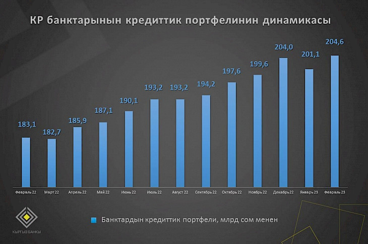 Улуттук банктан билдиришкендей, көрсөткүч жыл башынан бери 0,3 пайызга көбөйүп, 2022-жылдын февраль айына салыштырмалуу 11,7 пайызга көбөйдү (кредит портфелинин көлөмү 2022-жылдын февраль айынын аягы 183,1 млрд сомду, 2022-жылдын аягында 204,0 млрд сомду түздү), анын ичинде тармактар боюнча: