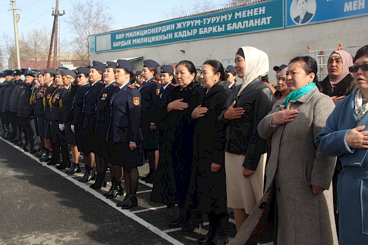 “Милиция кызматынын ар кандай оор түйшүктөрүн, күжүрмөн эмгегин аркалап келе жаткан кызматкерлердин арасында эр-азаматтардан кем калышпай, алардын катарында жарашыктуу милициянын кийимдерин кийген, ыйык Мекен алдында ант берген кыз-келиндерибиз менен биз сыймыктанабыз. Кыргыз тукумун улаган энесиздер!