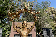 Эстелик мемориалында чек ара окуясынын курмандыгы болгон кичинекей Мадинанын элеси чагылдырылган. Колундагы жети көгүчкөн - тынчтыктын, жети облустун биримдигинин символу.