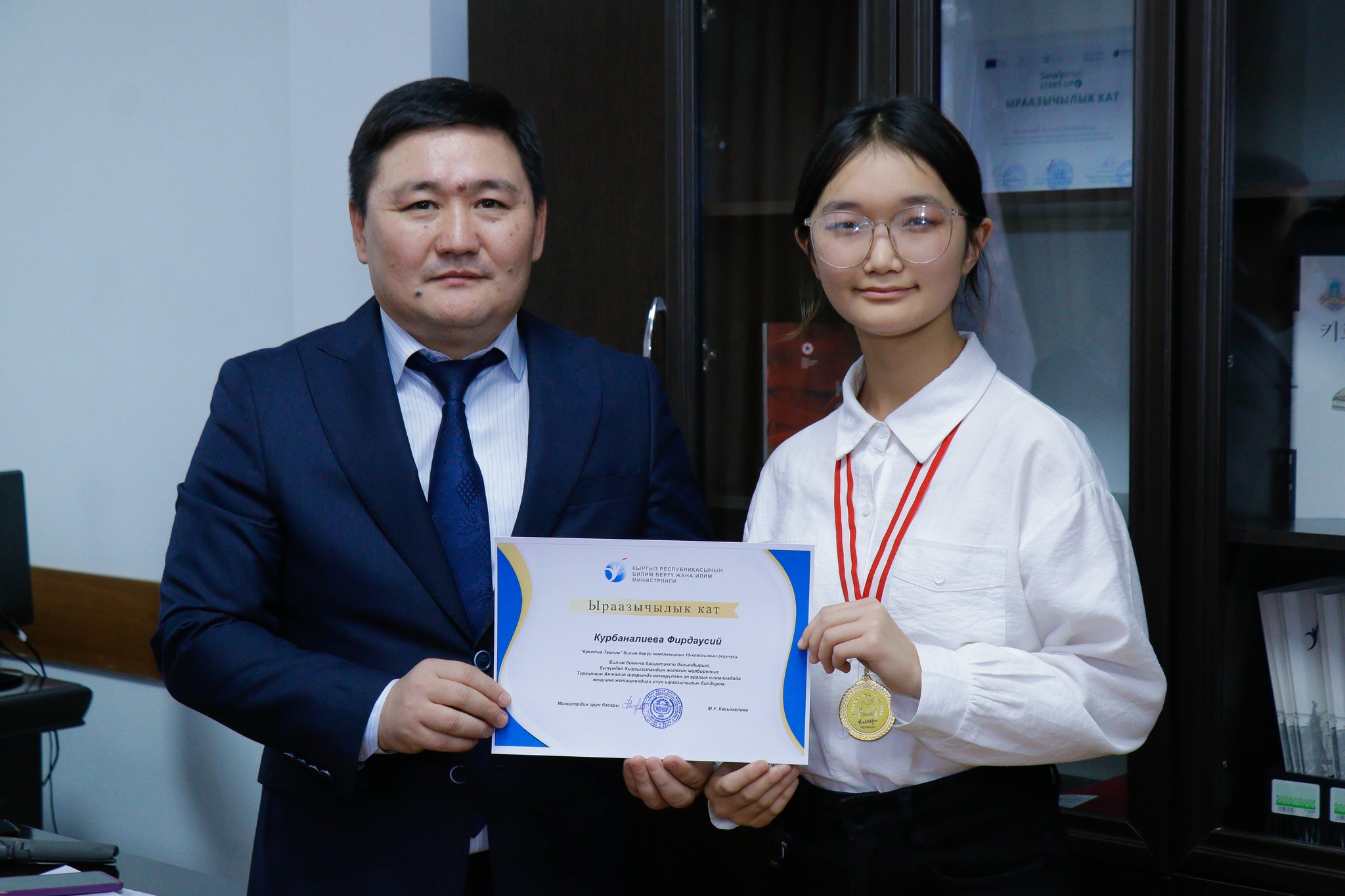 Бишкек, 28.11.23. /Кабар/. Бүгүн, 28-ноябрда билим берүү жана илим министринин биринчи орус басары Бекжан Супаналиев Анталия шаарында өткөн XV эл аралык билим (мультипредметтик) олимпиадасында 22 медаль жеңген окуучуларга министрликтин ыраазычылык каттарын тапшырды.