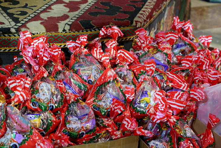 Майрамдын аягында ар бир балага жаңы жылдык белектер тапшырылды.