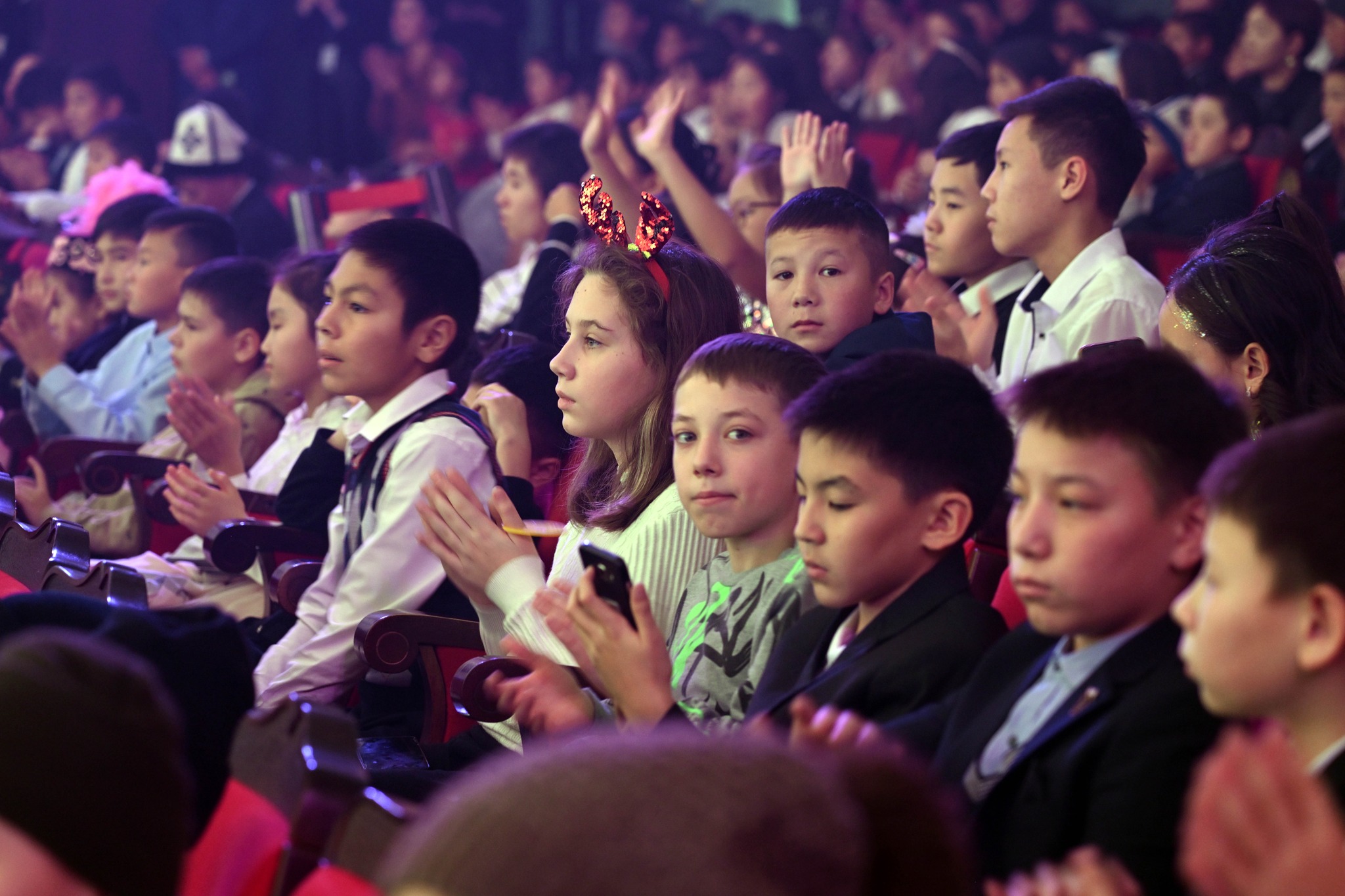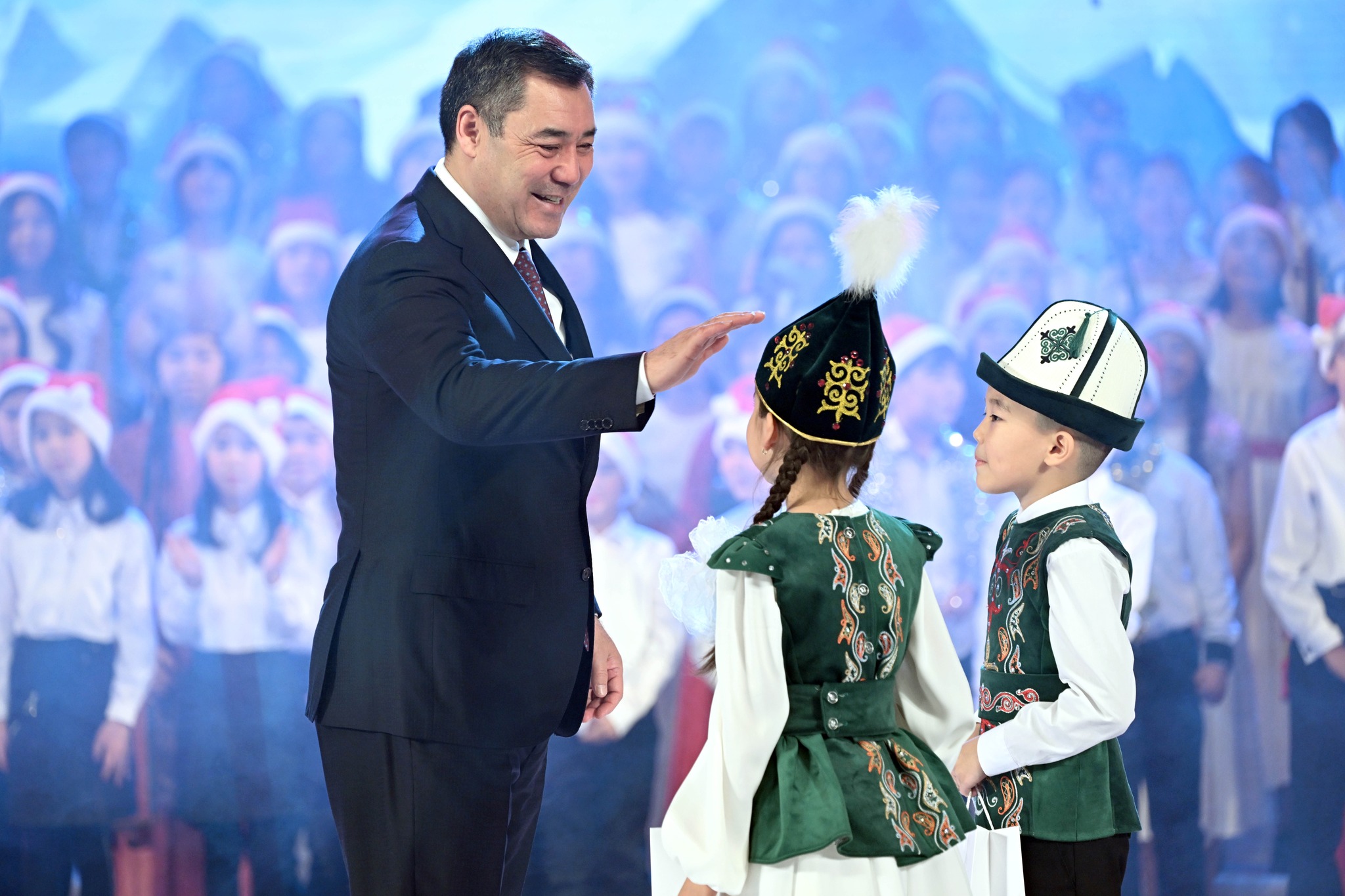 Бишкек, 22.12.23. /Кабар/. Президент Садыр Жапаров жана биринчи айым Айгүл Жапарова бүгүн Токтогул Сатылганов атындагы Кыргыз улуттук филармониясында салтка айланган балдар үчүн жаңы жылдык концертке катышты.