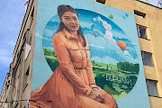 Бишкек, 23.11.18. / Кабар/. Логвиненко көчөсүндөгү Бишкек медициналык колледжинин жатаканасынын имаратынын сыртында маркум Бурулай Турдалы кызынын портрети тартылды.