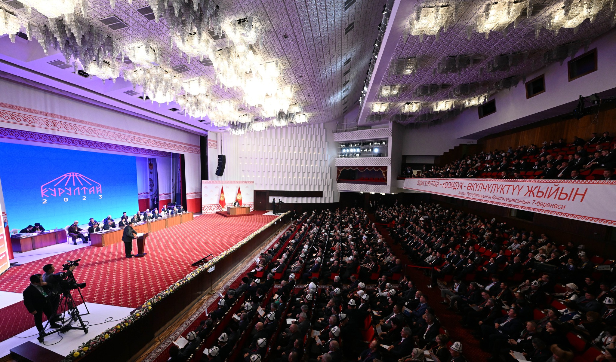 Бишкек, 16.12.23./Кабар/. Бишкекте Т.Сатылганов атындагы Кыргыз улуттук филармониясында мамлекеттик масштабдагы экинчи Элдик курултай ишин улантууда.