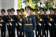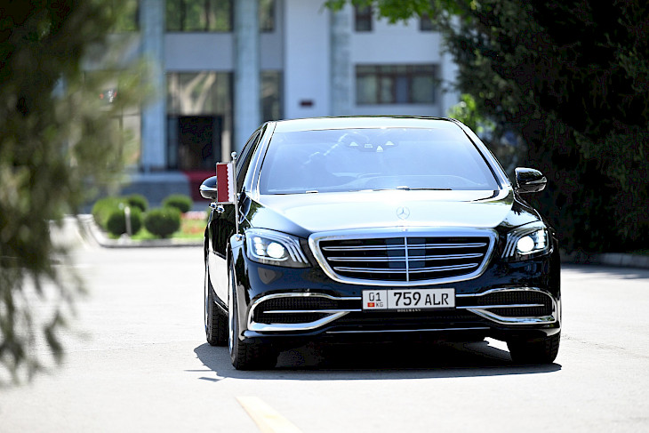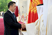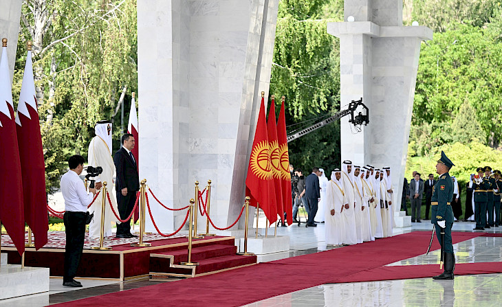 "Ала-Арча" Мамлекеттик резиденциясында мрамор чатырдын алдында Кыргызстандын жана Катар мамлекетинин мамлекеттик желектери желбиреп турду, Ардак кароол тизилип, килемчелер төшөлдү.