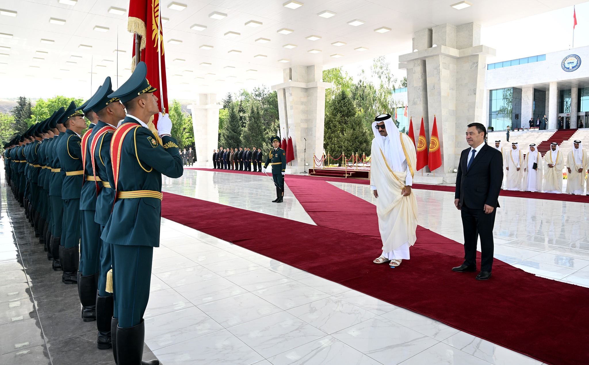 Өлкө лидерлери бири-бири менен учурашкан соң Кыргызстандын жана Катар Мамлекетинин мамлекеттик гимндери жаңырды. Ардак кароол ротасынын командиринин рапортунан кийин мамлекет башчылары тизилген жоокерлердин алдынан өтүштү.