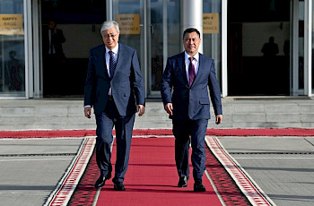 Кыргыз Республикасынын Президенти Сооронбай Жээнбеков мамлекет башчыларын Конгресс-холлдун имаратында тосуп алды.