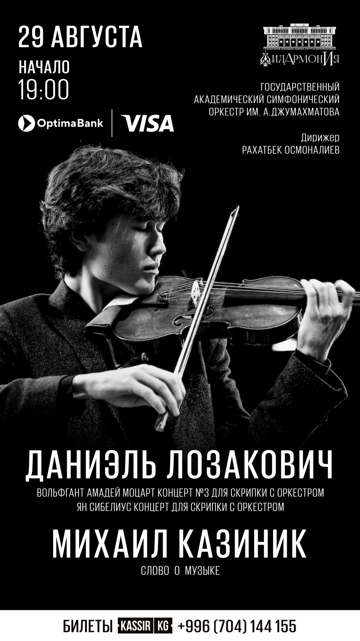 Бишкек, 12.08.24. /Кабар/. Бишкекте Даниэль Лозакович 23-жаштагы белгилүү швециялык скрипка-виртуозу, кыргыздын жээни, “скрипканын ханзаадасы” Даниэль Лозакович Моцарт менен Сибелиусту аткарат.