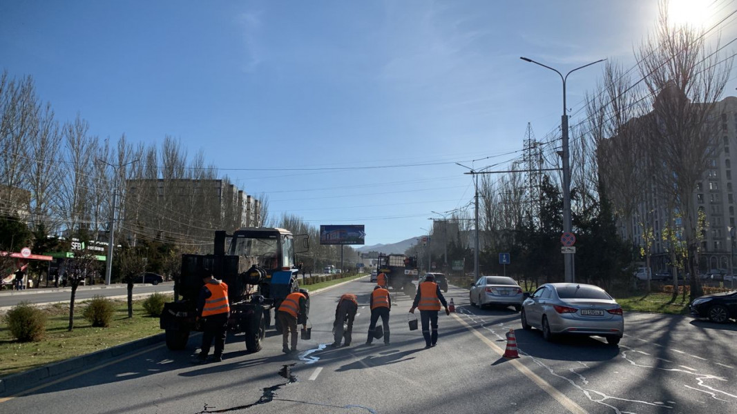 Шаардык мэриядан билдиришкендей, “Бишкекасфальтсервис” муниципалдык ишканасынын кызматкерлери жолдордо пайда болгон жаракаларды битум мастикасы менен толтуруп, кыштын камын көрүүдө.