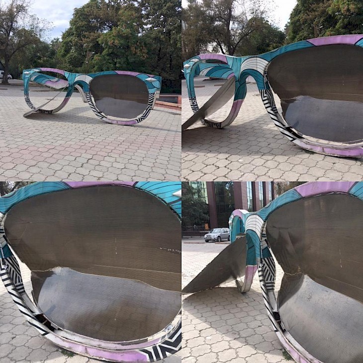 Бишкек, 19.09.17 /Кабар/. Бишкектин Жаштар аллеясына бир жыл мурда орнотулган “Көз айнек. Көз караш” арт-инсталляциясын белгисиз бирөөлөр сындырып кетишти. Бул тууралуу инсталляциянын авторлорунун бири Сергей Келлер өзүнүн фейсбук баракчасына жазып чыкты.