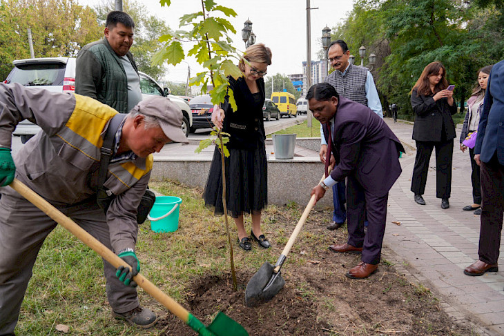 Муниципалитеттен билдиришкендей, көчөт отургузуу акциясына шаар мэринин орун басары Виктория Мозгачева, Индиянын Кыргызстандагы элчилигинин өкүлдөрү катышты.