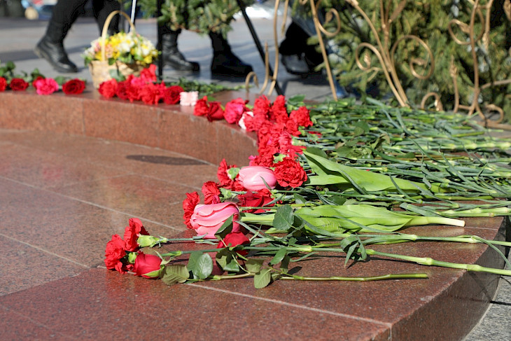 Митингдин катышуучулары Өчпөс отко гүл коюшуп, курман болгондорду бир мүнөттүк тыныгуу менен эскерип, андан соң салюттук топ куралдан үч жолу атуу менен залп беришти.