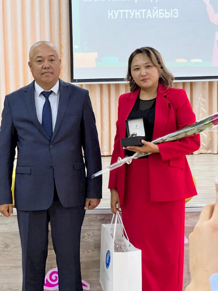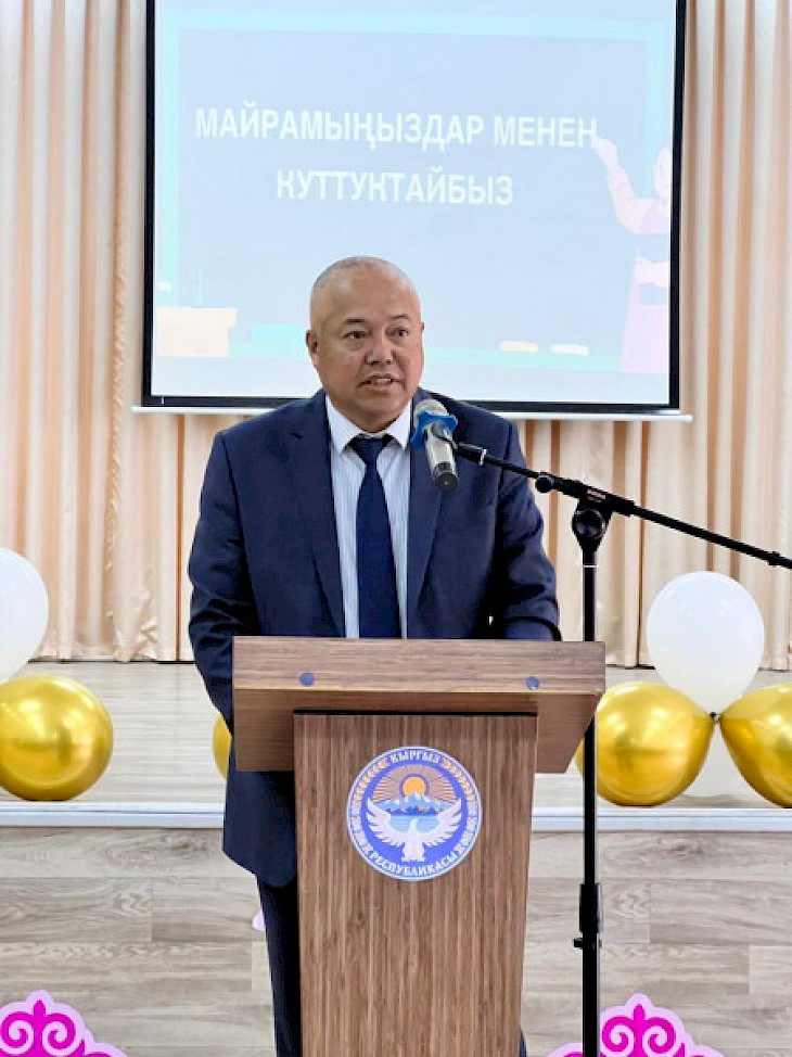 Ленин районунун акими Жыргалбек Шакиев да мугалимдерди куттуктап, райондук сынакта өзгөчөлөнгөн мугалимдерге баалуу сыйлыктарды тапшырды.
