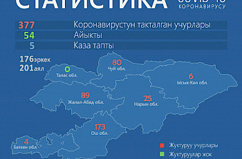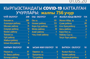 "19-майга карата саламаттык сактоо уюмдарында 109 994 коргоочу костюм, 122 267 респиратор, 1 388 277 беткап бар. Жакынкы күндөрү Кытайдан кошумча дагы 30 000 респиратор, 30 000 медициналык көз айнек, 150 000 медициналык маска жана 100 000 ПЦР-тест гуманитардык жардам катары келди. Кечээ Иран өлкөсүнөн дагы гуманитардык жардам келди", - деди ал.