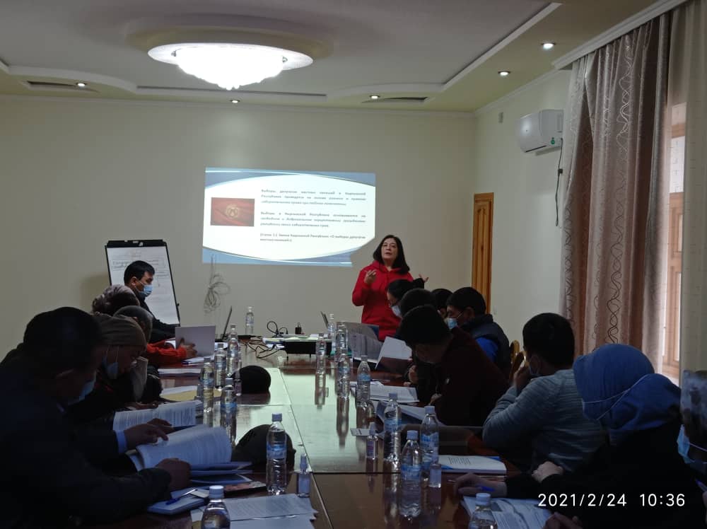 Маалымакта ылайык, алгачкы тренингдер Талас жана Токмок шаарларындагы шаардык кеңештерде болуп өттү. Катышуучулар жергиликтүү кеңештерге шайлоолорго катышуунун мыйзамдуу негиздери жана 448 жергиликтүү кеңештерде өтө турган учурдагы шайлоонун өзгөчөлүктөрү менен таанышты.