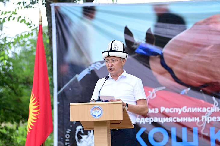 "Байыркы кыргыздын жоокердик духу канында, жанында бар экенин Айсулуу Тыныбекова, Акжол Махмудов баштаган балбандарыбыз дүйнөлүк олимпиадаларда далай ирээт далилдешти. Спортчуларыбыз жараткан ийгиликтер улуттук рухту көтөрүп, ынтымакты ширелтип, өлкөнүн өнүгүүсүнө чоң үмүттөрдү жандырууда. Эр эңиш бул кан кызыткан спорт менен эле чектелип калбайт. Бул кыргыздын тарыхы! Жоону саяр куралы жокто эр жүрөк жоокерлерибиз темирдей бекем каруусуна, турпатына уюган күч-кубатына жана алдында туйлаган төрт туягына ишенген", - деди федерациясынын президенти Азыгалиев.