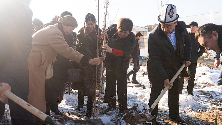 "Бүгүнкү күндө "Алтын балалык" медико-реабилитациялык комплексин оңдоп түздөө менен эле чектелип калбастан, айлана-тегерегин көрктөндүрүп, жашылдандыралы деп келип отурабыз. Келечекте бул борбор Кыргызстандан эле эмес, башка чет мамлекеттен да ден соолугун калыбына келтирүү үчүн келген бейтаптарга кызмат көрсөтүүчү борборго айланат деп ишенем. Ал эми бүгүнкү отургузулган көчөттөр чоң сейил бакка айланып, бейтаптарга жакшы өбөлгө түзөт", - деди Аалиев.