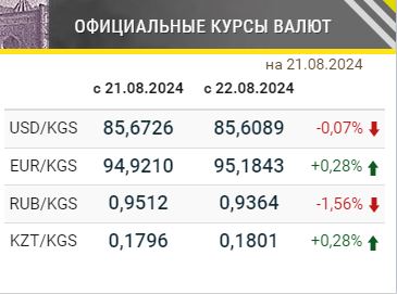 Бишкек, 21.08.24. /Кабар/. Улуттук банк 22-августка карата валюта курсунун жаңыланган маалыматтарын жарыялады.