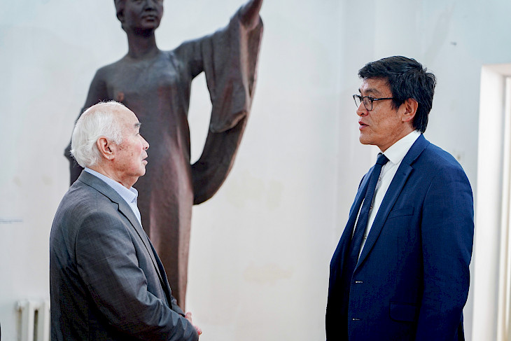 Бишкек, 17.05.24. /Кабар/. Министрлер кабинетинин төрагасынын орун басары Эдил Байсалов КР Эл сүрөтчүсү жана Баатыры, көрүнүктүү скульптор Тургунбай Садыковго барып, анын ысымын алып жүргөн Улуттук көркөм сүрөт академиясынын музейинде болду.