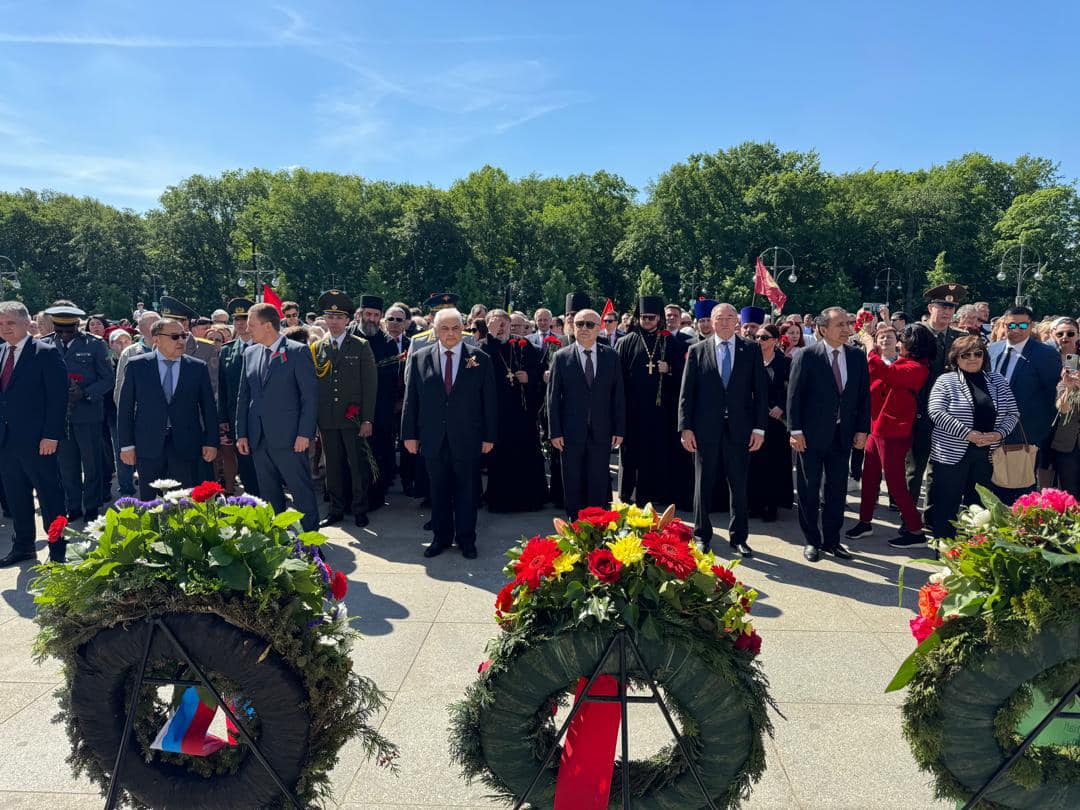 Бишкек, 10.05.24. /Кабар/. Кыргызстандын Германиядагы элчиси Өмүрбек Текебаев Улуу Ата Мекендик согуштагы Жеңиштин 79 жылдыгына карата Берлин шаарындагы Тиергартен жана Трептов паркында курман болгон советтик жоокерлердин эстеликтерине гүлчамбар коюу аземине катышты.