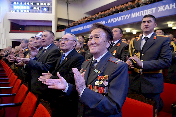 Өз сөзүндө Мамлекет башчысы ата мекендик ички иштер органдарынын түзүлүү тарыхына токтолуп, жарандарыбыздын мамлекетке, бийликке болгон ишеними катардагы милиционерден башталарын белгиледи.