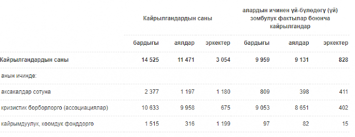 Бишкек, 13.12.23. /Кабар/. 2022-жылы калкка социалдык-психологиялык жардам көрсөтүүчү кризистик борборлорго жана башка адистештирилген мекемелерге үй-бүлөдөгү зомбулук фактылары боюнча 10 миңге жакын адам кайрылган, алардын көпчүлүгү, тактап айтанда, 92%ын аялдар түзөт. Бул тууралуу Кыргызстандын Улуттук статистика комитети билдирет.