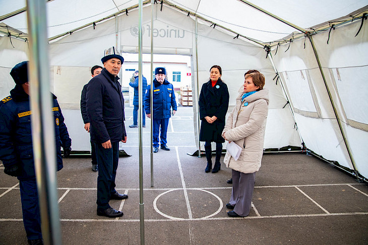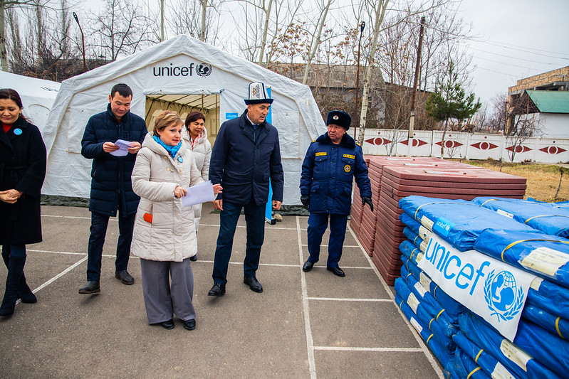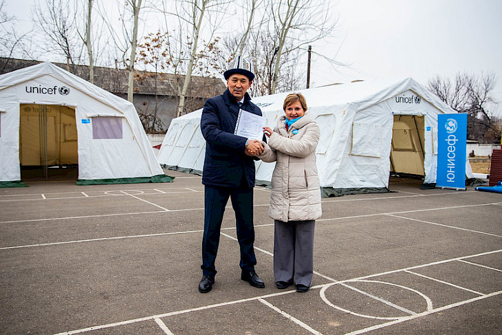 Чатырларды тапшыруу аземи Ош шаарында өтүп, ага өзгөчө кырдаалдар министринин биринчи орун басары Азамат Мамбетов жана ЮНИСЕФтин Кыргызстандагы өкүлүнүн милдетин аткаруучусу Кристина Бруджиоло катышты.