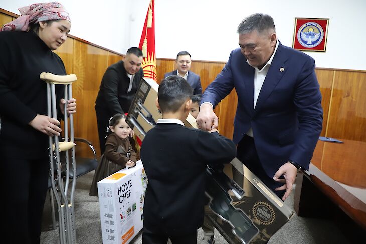 УКМК төрагасы К.Ташиев жардамга муктаж үй-бүлөгө 3 бөлмөлүү батирдин ачкычын тапшырып, каалоо-тилектерин айтты.