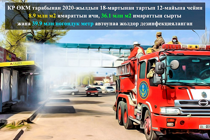 Бишкек, 12.05.20. /Кабар/. 2020-жылдын 18-мартынан тартып 12-майына чейин 8,9 млн чарчы метр имараттын ичи, 36,1 млн чарчы метр имараттын сырты, жалпы 45 млн чарчы метр аймак жана 39,9 млн погондук метр автоунаа жолдор дезинфекцияланган. Бул тууралуу Өзгөчө кырдаалдар министрлигинин басма сөз кызматы кабарлайт.