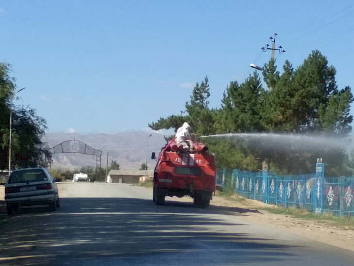 Белгилей кетсек, дезинфекциялоо иштери жарандар көп бара турган объектилерде, маселен дүкөндөр, банктар, базарлар, дарыканаларда жана унаа жолдордо жөө жүрүү жана өрт өчүрүү унаалары менен аткарылууда.