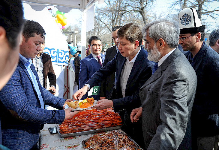 Бишкек, 21.03.18 /Кабар/. Премьер-министр Сапар Исаков бүгүн, 21-мартта Нооруз майрамына карата КР Тышкы иштер министрлиги жана Бишкек мэриясы уюштурган Дипломатиялык кайрымдуулук жарманкесине катышты.