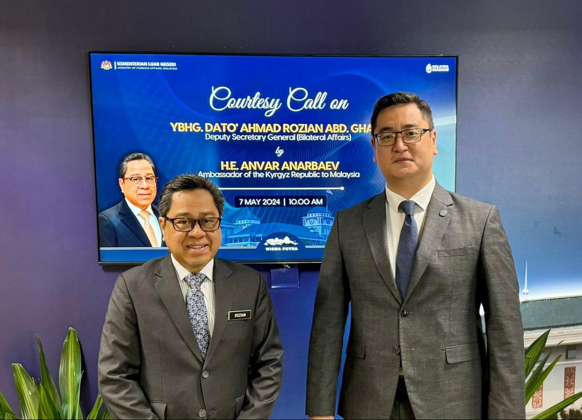 Бишкек, 08.05.24. /Кабар/. Күн мурун Кыргызстандын Малайзиядагы элчиси Анвар Анарбаев Малайзиянын Тышкы иштер министрлигинин эки тараптуу мамилелер боюнча башкы катчысынын орун басары Ахмад Розиан бин Абд. Гани менен жолугушту.