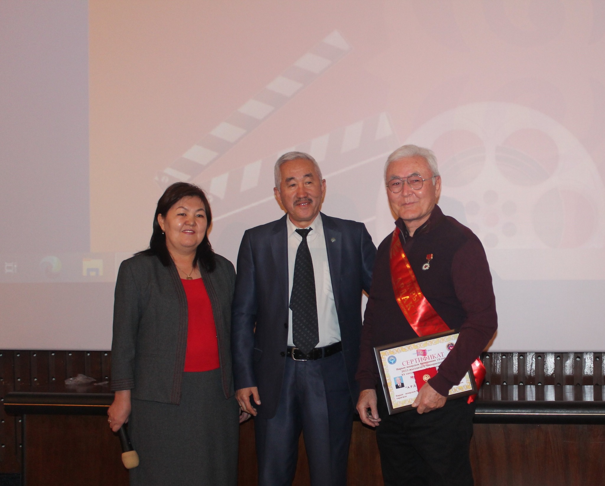 Андан соң бир катар кино ишмерлерине Кинематография департаментинин “Кыргыз киносунун отличниги” төш белгисин тапшырды.