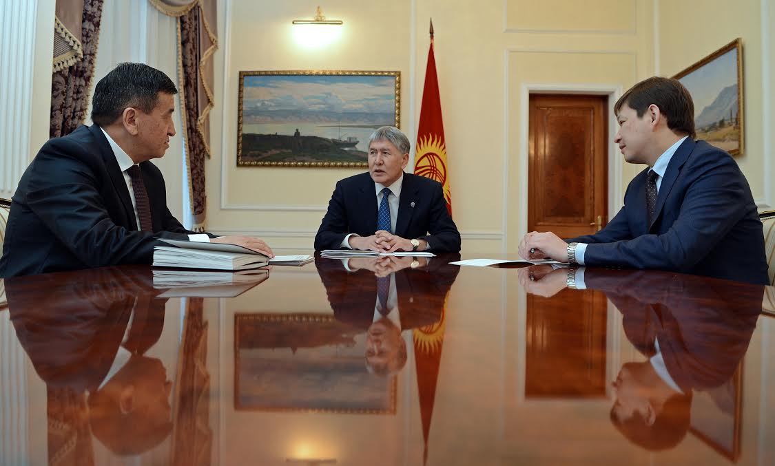 Бишкек, 28-апрель /Кабар/. Кыргыз Республикасынын Президенти Алмазбек Атамбаев бүгүн, 28-апрелде Премьер-министр Сооронбай Жээнбеков жана өз Аппарат жетекчиси Сапар Исаков менен өлкөдө биометриялык электрондук паспортторду киргизүү ишинин башталашы тууралу талкуулады. Бул тууралуу Кыргыз Республикасынын Президентинин аппаратынын маалыматтык саясат бөлүмү билдирди.