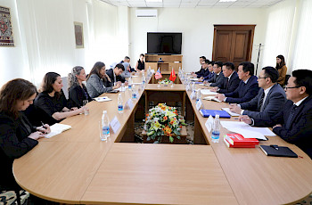 Кыргызстандын делегациясын тышкы иштер министринин орун басары Азизбек Мадмаров, Европа Биримдигинин делегациясын Европа тышкы иш-аракеттер кызматынын Россия, Чыгыш өнөктөштүгү, Борбордук Азия жана ЕККУ боюнча башкармалыгынын башчысы Люк Девин жетектешти.