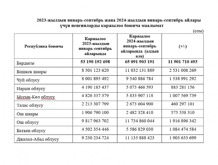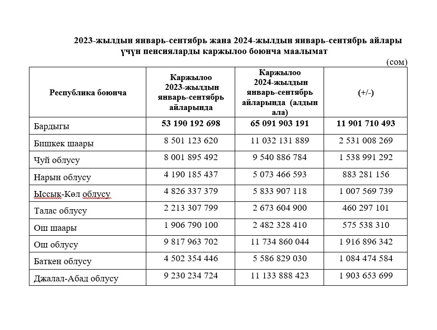 2024-жылдын январь-сентябрь айларында пенсияларды каржылоо боюнча маалымат төмөндөгүдөй: