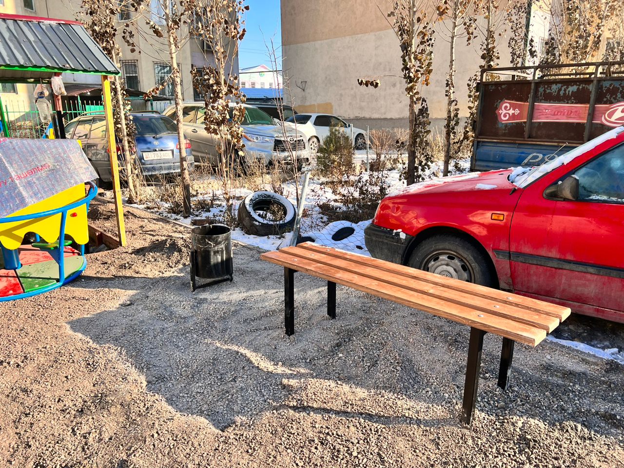Аянтчаларды жакшыртуу боюнча иштер жүргүзүлүп, тактап айтканда, аянтчалардын үстү толтурулуп даярдалды, бордюрлар, отургучтар, таштанды челектери орнотулду.