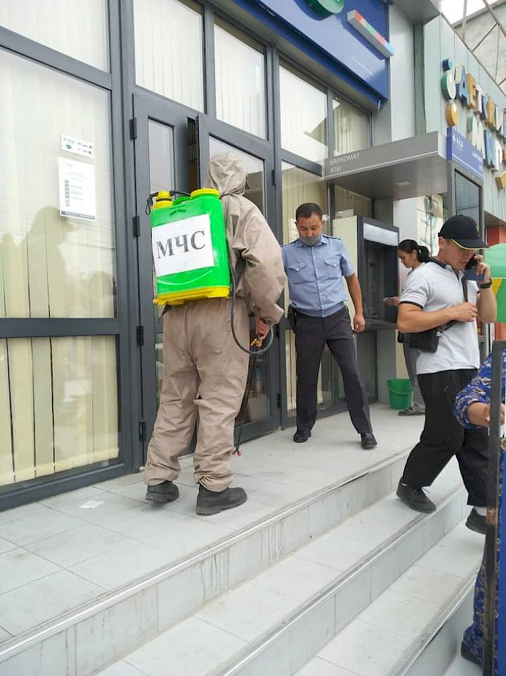 Белгилей кетсек, дезинфекциялоо иштери жөө жүрүү жана өрт өчүрүү унаа менен аткарылып, жарандар көп бара турган объектилерге, маселен дүкөндөр, банктар, базарлар, дарыканаларда жана унаа жолдордо жүргүзүлүүдө.