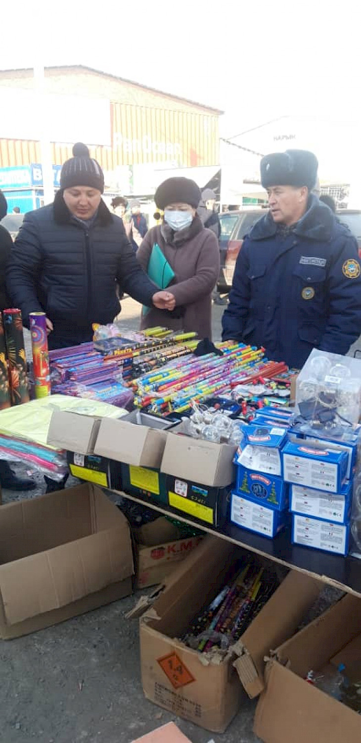 Жаңы жылдык майрамдарды белгилөө максатында, Кыргыз Республикасынын Ички иштер министрлигинин райондук башкармалыктарынын кызматкерлери, Өзгөчө кырдаалдар министрлигинин райондук бөлүмдөрүнүн кызматкерлери жана райондук муниципалдык башкармалыктардын кызматкерлери менен биргеликте Бишкек, Ош шаары жана Нарын, Жалал-Абад, Кара-Көл региондор аралык башкармалыктын өрт көзөмөлдөө бөлүмүнүн инспекторлору тарабынан соода түйүндөрдө, базарларда, көңүл ачуу борборлорунда жана калктын массалык чогулган жайларында ири өлчөмдөгү өзгөчө кырдаалдарга жеткирбөө, өрт кырсыгынын чыгышын алдын алуу жана өрт коопсуздук абалын жакшыртуу максатында иш-чаралар көрүлүүдө.