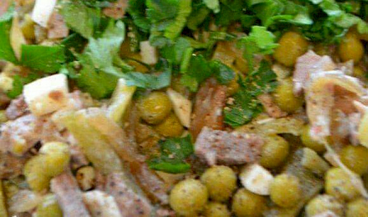 Салат идишине салып тилди, пияз менен куурулган козу карынды, бадыраң, буурчак, петрушканы аралаштырабыз. Туз, калемпир себелеп, майонез менен аралаштырып койсок салат даяр болот.
