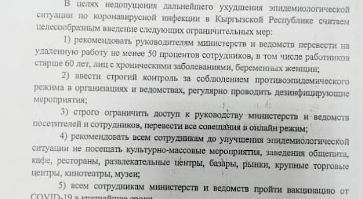 1. Минстрлик жана ведомстволордун жетекчилеринекызматкерлердин кеминде 50%ын, анын ичинде 60 жаштан ашкан кызматкерлерди, өнөкөт оорусу барларды, кош бойлуу аялдарды аралыктан иштөөгө өткөрүлсүн.