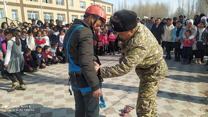 Бишкек, 01.03.22. /Кабар/. Нарында Өзгөчө кырдаалдар министрлигинин кызматкерлери өзгөчө кырдаалдар боюнча түшүндүрүү иштерин жүргүзүүдө.